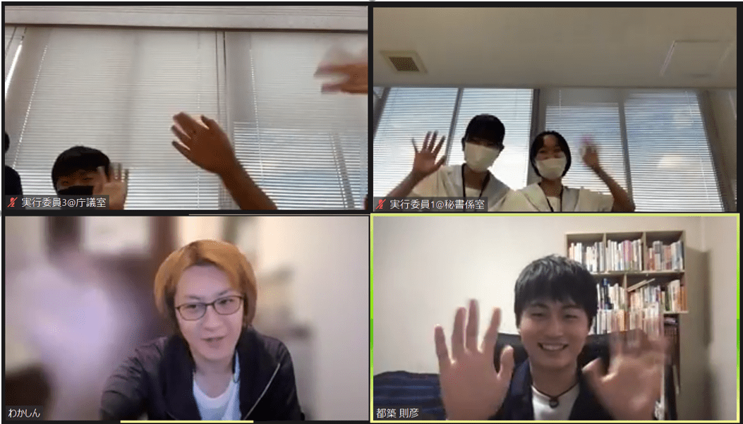 プロジェクト実行委員も活動拠点と自宅にわけてそれぞれから参加。活動拠点では係ごとに部屋をわけて少人数で視聴しました。