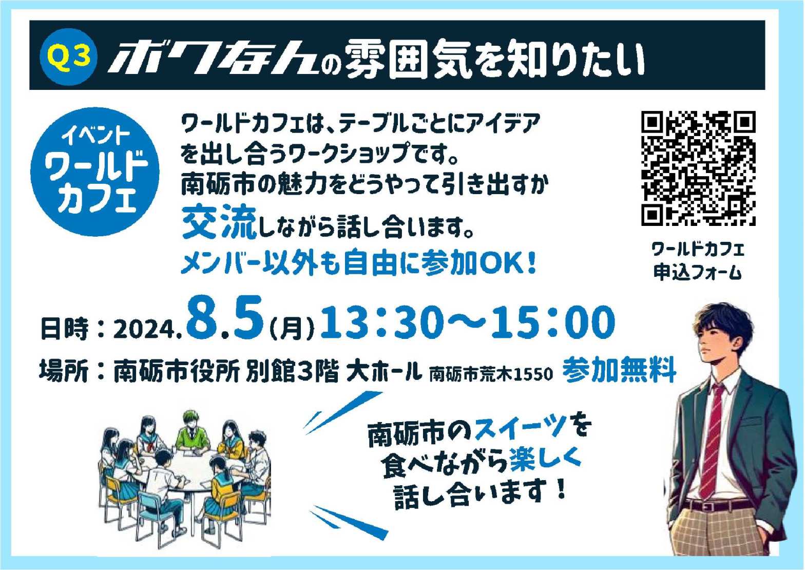 今後は独自のイベント開催を検討しており、そのヒントとなるようなアイデアを出し合えたらと思っています。また、当日は様々な南砺市のスイーツをたくさん準備しますので、地元の味を味わいながら、楽しく、高校生の自由な発想でアイデアをお願いします!アイデア次第では、会いたい有名人に会えるかも...