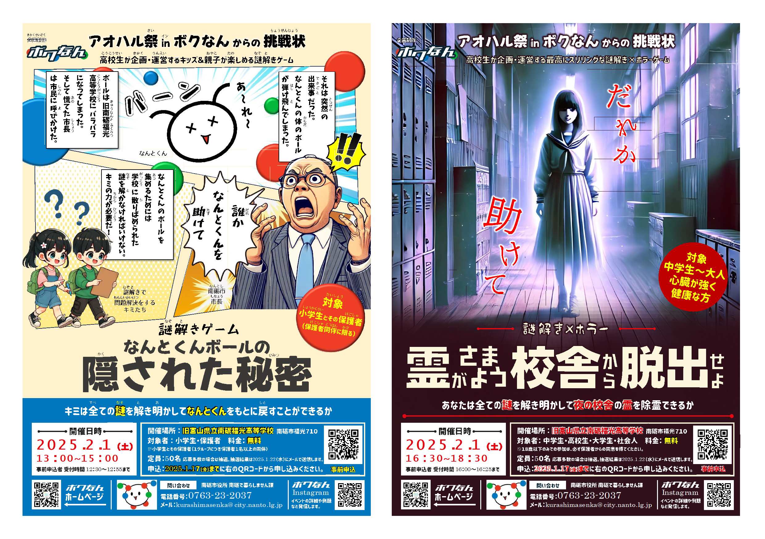 先日、HPに掲載をした、「アオハル祭inボクなんからの挑戦状」について、令和7年2月1日(土)に旧富山県立南砺福光高等学校校舎にて開催することとなりました!